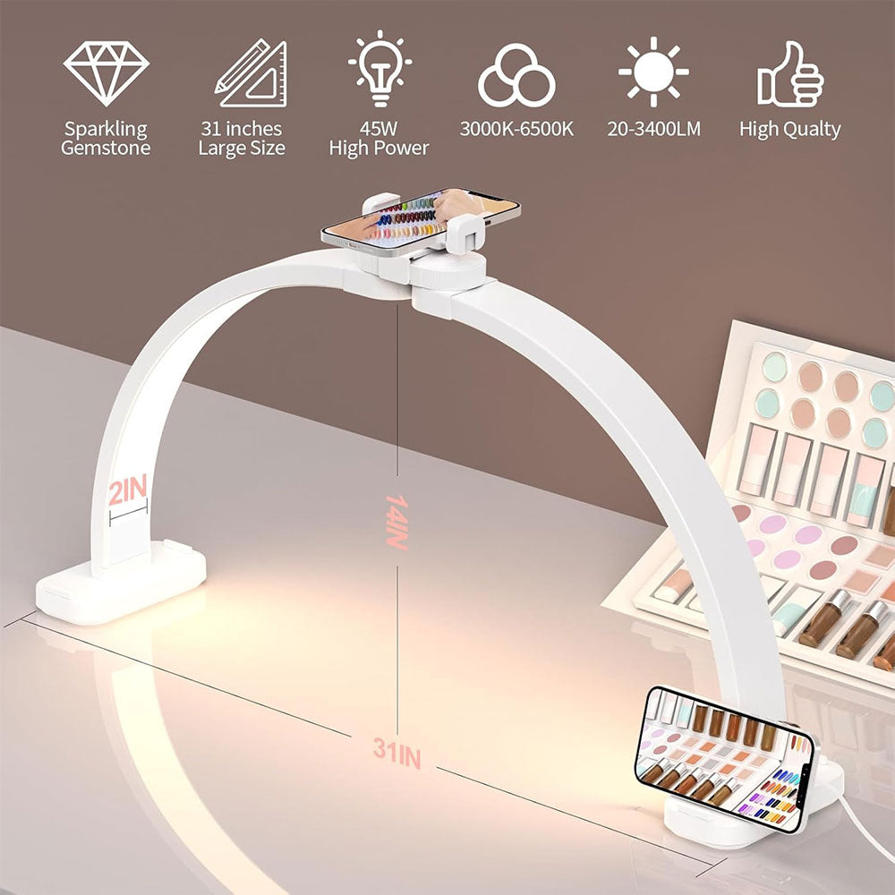 The 31-inch arc shape evenly distributes soft, shadow-free light for flawless illumination. Perfect for content creators, beauty professionals, and salon setups.
